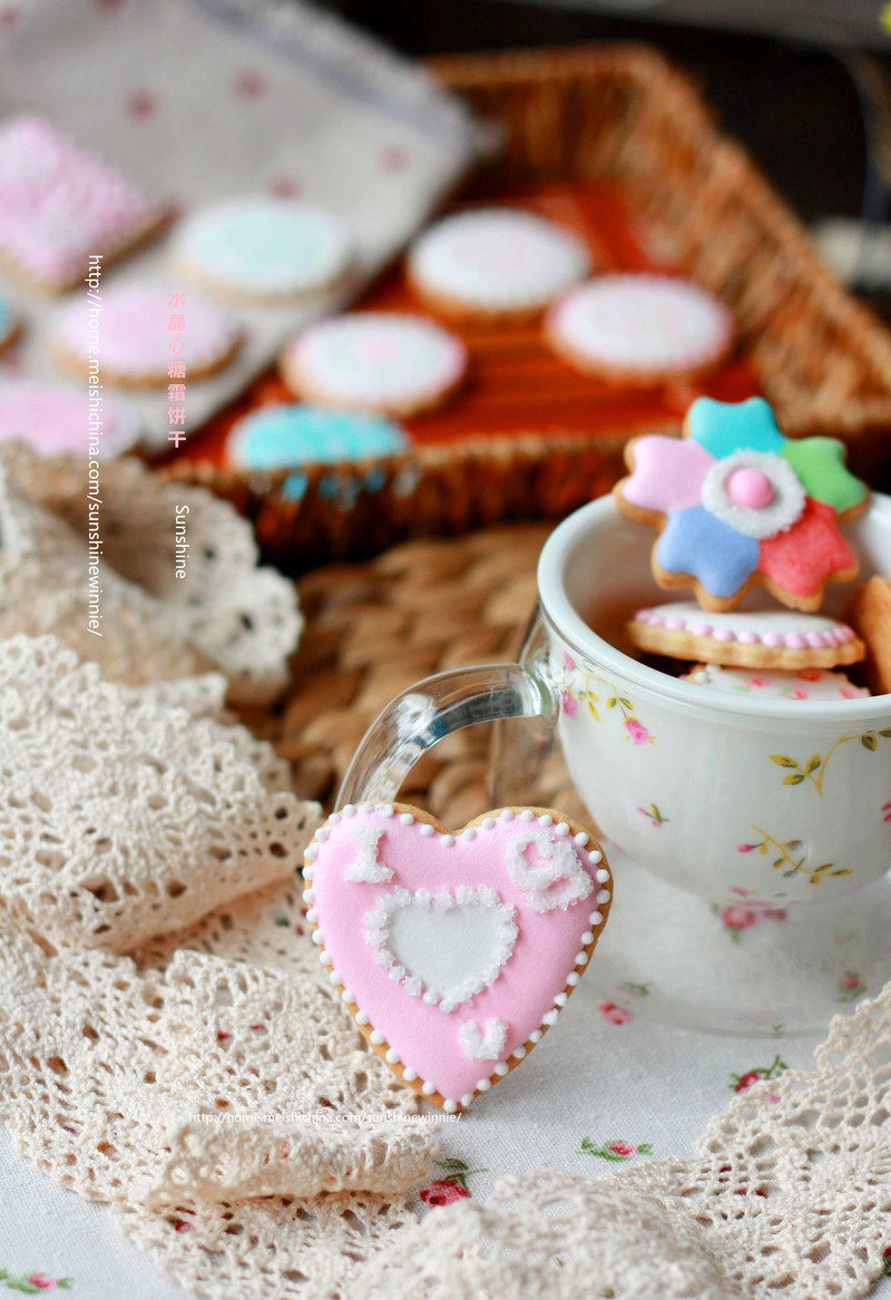 饼干原料:黄油50克糖粉30克鸡蛋液25克低粉125克香草精几滴(没有可不用)烘焙:烤箱中层170度10分钟左右糖霜原料1:蛋清粉10克糖粉150克温水30ML左右糖霜原料2:蛋白1个糖粉150克白醋几滴1、做饼干的时候,如果面团太软不好操作,可以将面团入冰箱冷藏片刻。2、蛋清粉配方和生蛋白配方我各做了一次,过程中只拍了用生蛋清制作的照片,紫色系列是用生蛋白配方做的,彩色卡通系列是用蛋清粉配方做的。3、最后糖霜的状态,其实是需要不同的状态来进行的,比如说铺底的糖霜,就要求比较稀一些,这样在表面容易流平,而描线条的糖霜需要硬挺一些,这样描画出来会更清晰,但我偷懒只用了一种状态的,所以最后的成品还是有很多地方不满意,下次再做一定会再认真一些。