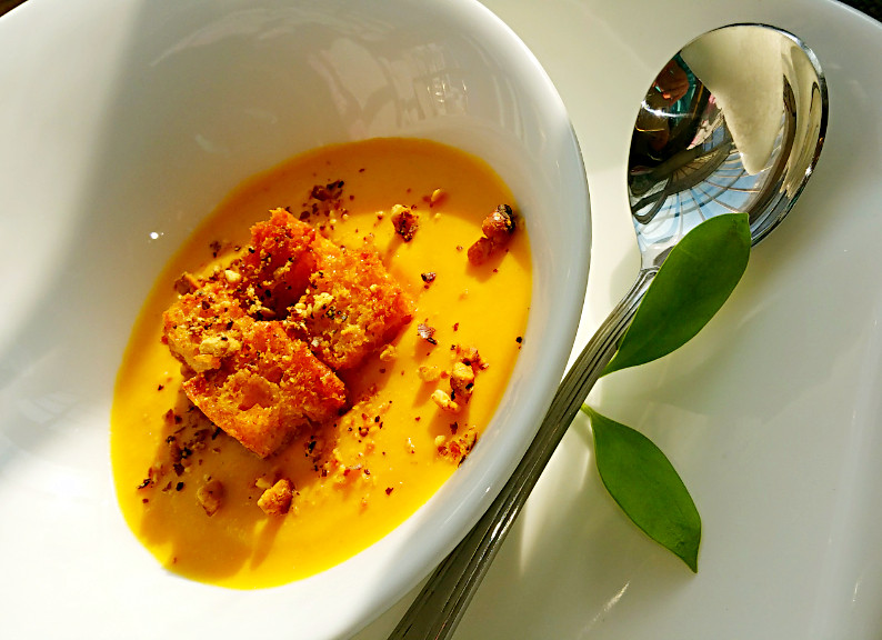 1.南瓜泥是上次做南瓜派剩下来的,自己做很简单,蒸熟打成泥,加奶油和黄油熬制到合适的浓度即可。2.烤面包块是最近刚做的,前一篇有讲解过程。3.加牛奶的时候不要一次加入,慢慢加,可以控制自己喜欢的浓度。4.香蕉的甜味和红萝卜的甜味已经很足,可以根据自己的需要再加蜂蜜或者白糖。