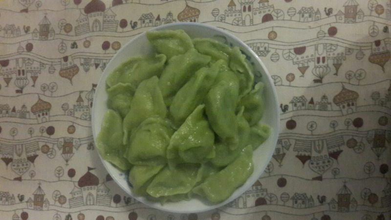 5:用蔬菜汁或成软硬适中的面团,盖上保鲜膜松弛一会,松弛面团的时间把饺子馅和好,和馅是忘记拍照了