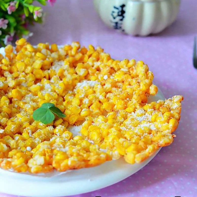 6:开中火,升高油温继续炸3-5分钟,待玉米粒金黄酥脆关火,倒出油,在玉米烙上撒白糖出锅。