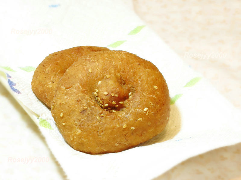 7:把面稍压扁,用手指在中间稍戳一个洞,但不要戳穿,然后边拉边转着向外扩展,把里面的那层膜拉大,点上用原材料五香粉1/2茶匙、盐1茶匙、水3汤匙兑成的盐水,撒上芝麻,再就手按一按芝麻;