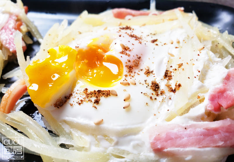 2:油锅煎培根,从水中捞出土豆丝放入锅中,放些盐、CUCU白醋,炒至5分熟时,把菜分成两堆,中间掏个坑,每堆打入一个可鲜食的鸡蛋,盖上锅盖焖3分钟。