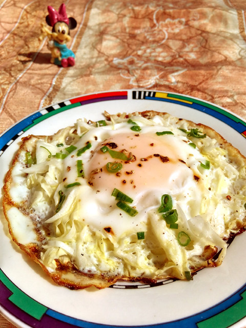 1:用料:卷心菜叶1片,鸡蛋1个,葱花少许,盐适量,黑胡椒碎少许