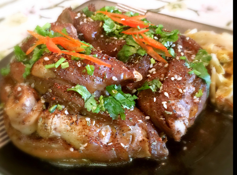 7:烤盘铺锡纸,底下铺一层喜欢的蔬菜,包菜,西蓝花,洋葱都可以。放上猪蹄,浇两勺煮猪蹄底汤,再撒上准备好的烧烤料。上面盖上锡纸。烤箱预热200度,中下层烤20分钟
