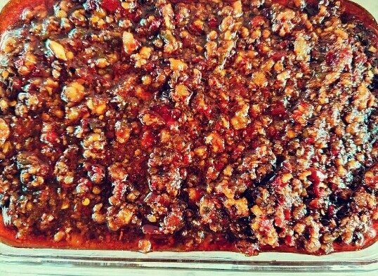4:将牛肉放入烤盘,倒入番茄酱、芝麻油和熟芝麻拌匀。烤箱200华氏度。10分钟出炉,冷却即食。(如果没有烤盘此步骤可用微波炉代替,只是时间和活力需自己掌握。)