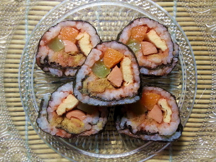 寿司紫菜适量;寿司醋适量;沙拉酱适量;鸡蛋适量;黄瓜适量;大根条适量;火腿肠适量;猪肉肉松适量;青芥辣适量;