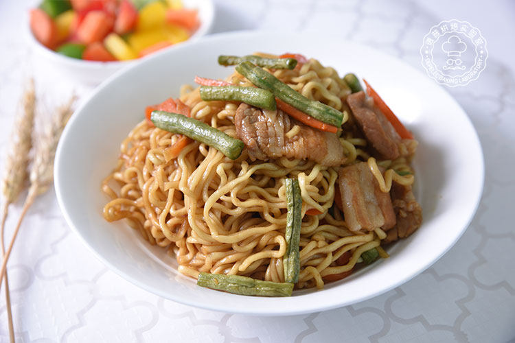 猪五花肉片适量;胡萝卜适量;豆角段适量;方便面适量;盐适量;