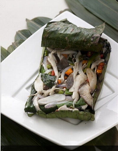 3:然后将主料配料调味包在芭蕉叶中,放烤炉上烘烤,装盘即可
