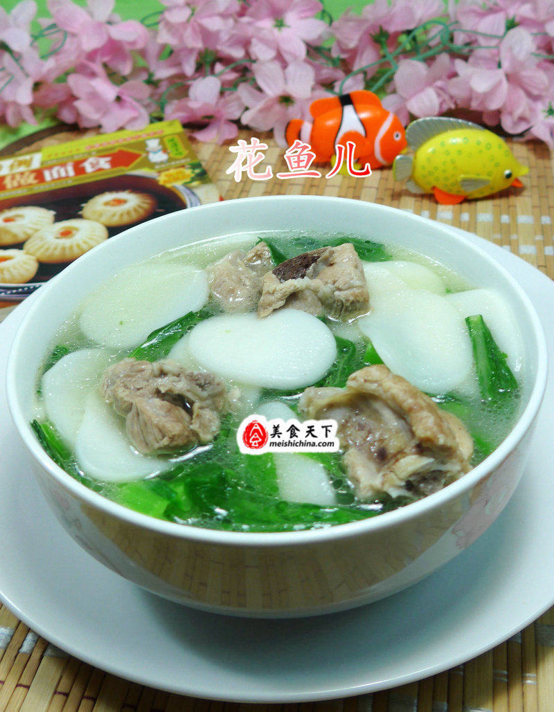 排骨150克;玉米适量;萝卜适量;葱姜适量;年糕2人份;