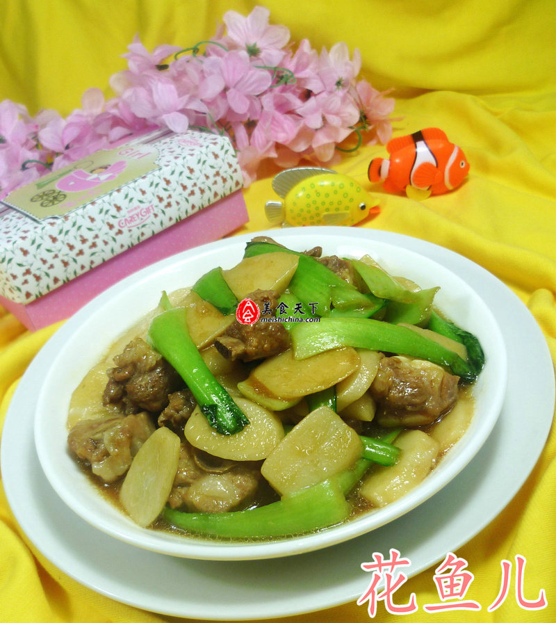 1:食材:年糕片、排骨(已清洗焯水)、油菜蕻(已清洗)