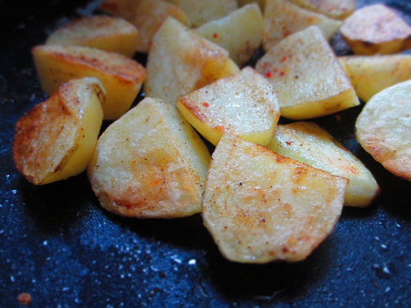 3:土豆蒸熟后,平底锅中放入油,烧至六成热,放入土豆用小火煎,一直煎到外皮变得焦黄,香脆。注意尽量每一面都煎到。