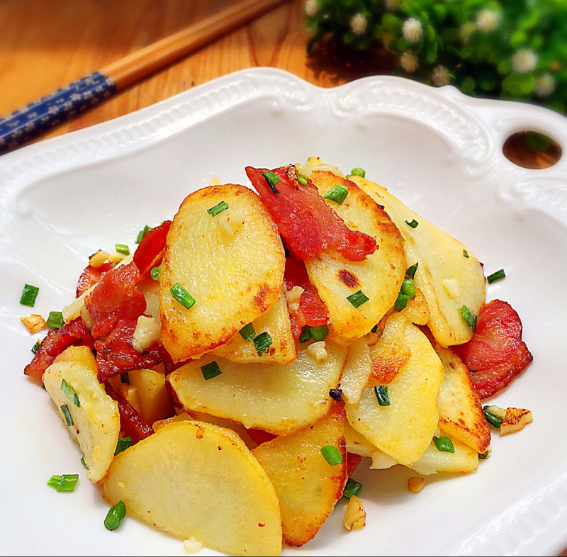 土豆1个;荷美尔经典飘香炒菜培根85克;葱1棵;蒜2块;盐1茶匙;油1茶匙;