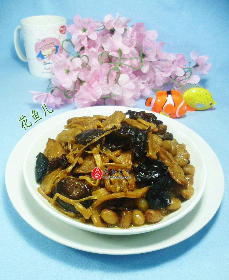 4:随后,合入已清洗好的黑木耳、黄花菜、香菇和已煮熟的花生米翻炒一下。