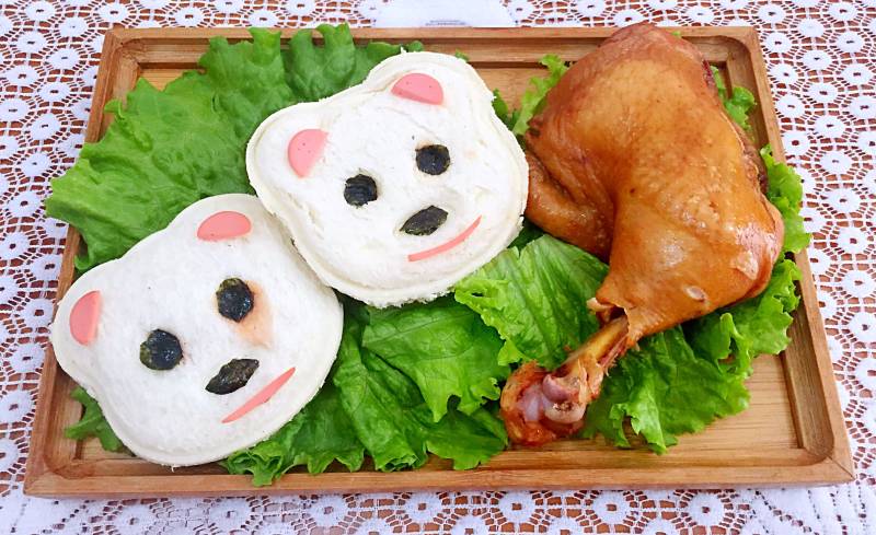 5:将海苔和香肠减出自己需要的形状装饰在熊宝的脸上