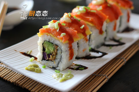 10:然后切块摆到盘子里,表面挤上沙拉酱和鱼子酱,配寿司酱油和芥末食用