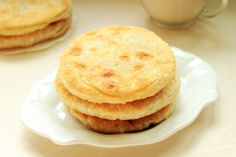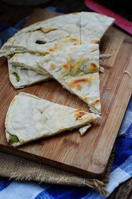 3:把面团擀成牛舌状然后涂上酥油,再放上适量的葱