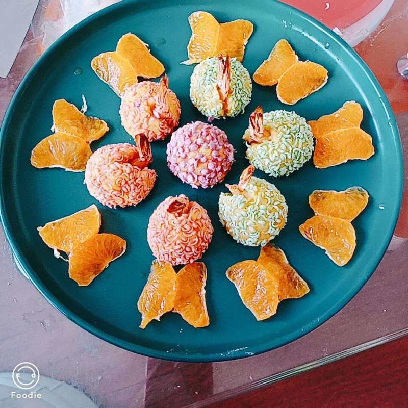 虾适量;桔子1个;蜂蜜少许;油适量;玉米淀粉适量;彩色面包糠适量;