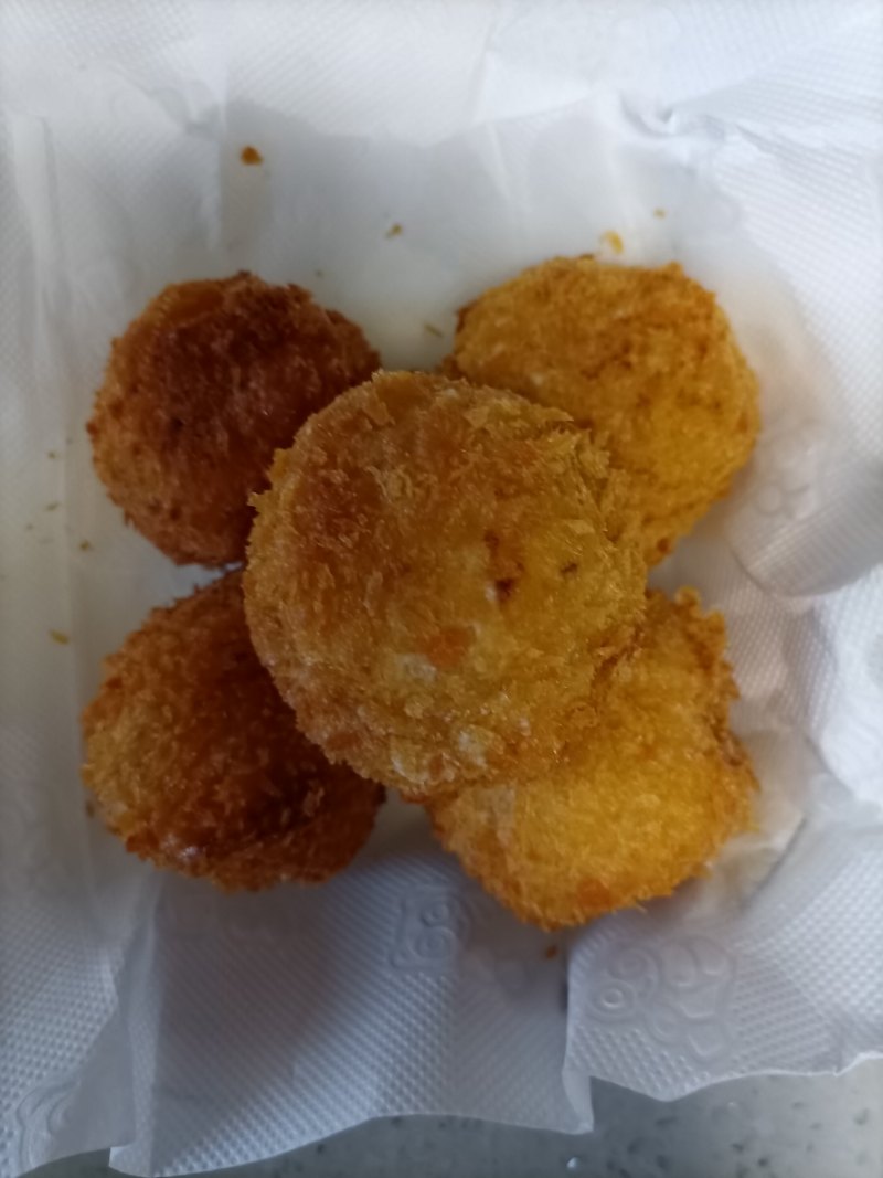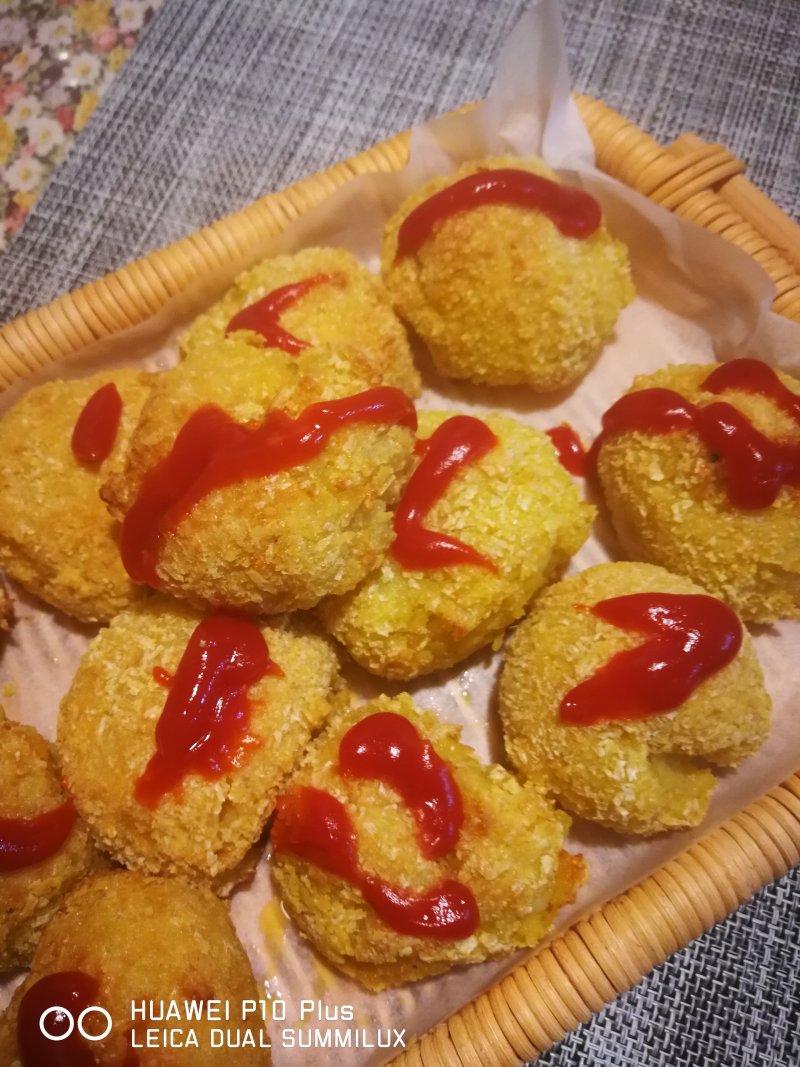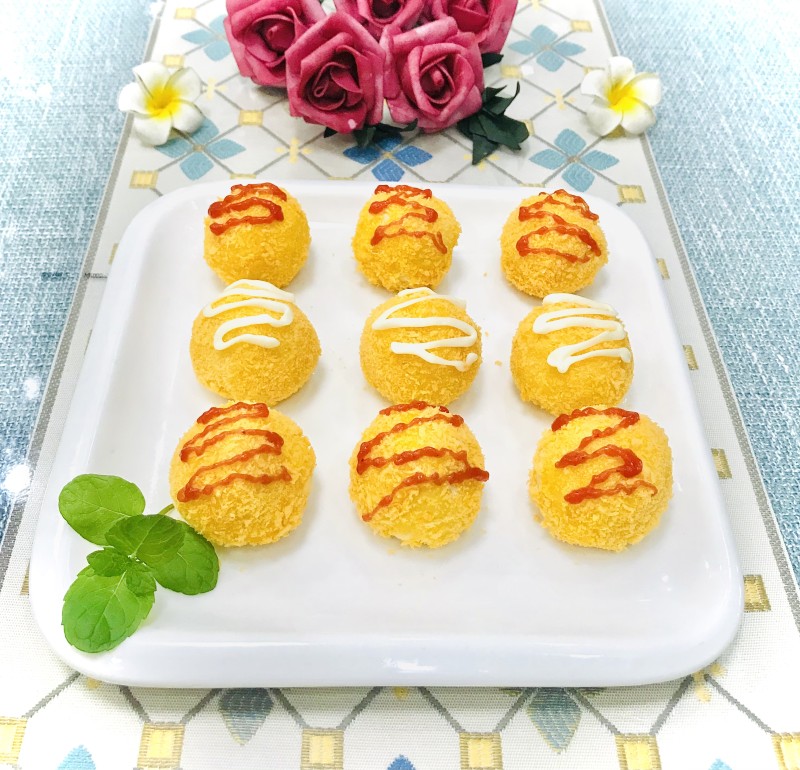8:先把芝士土豆球裹上一层玉米淀粉,沾满鸡蛋液,最后裹上面包糠。