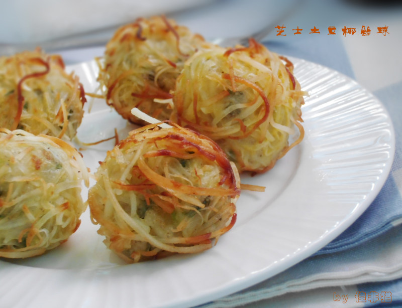 5:即拌好的土豆泥适量做成小饼,中间加入奶酪块,再捏成圆;