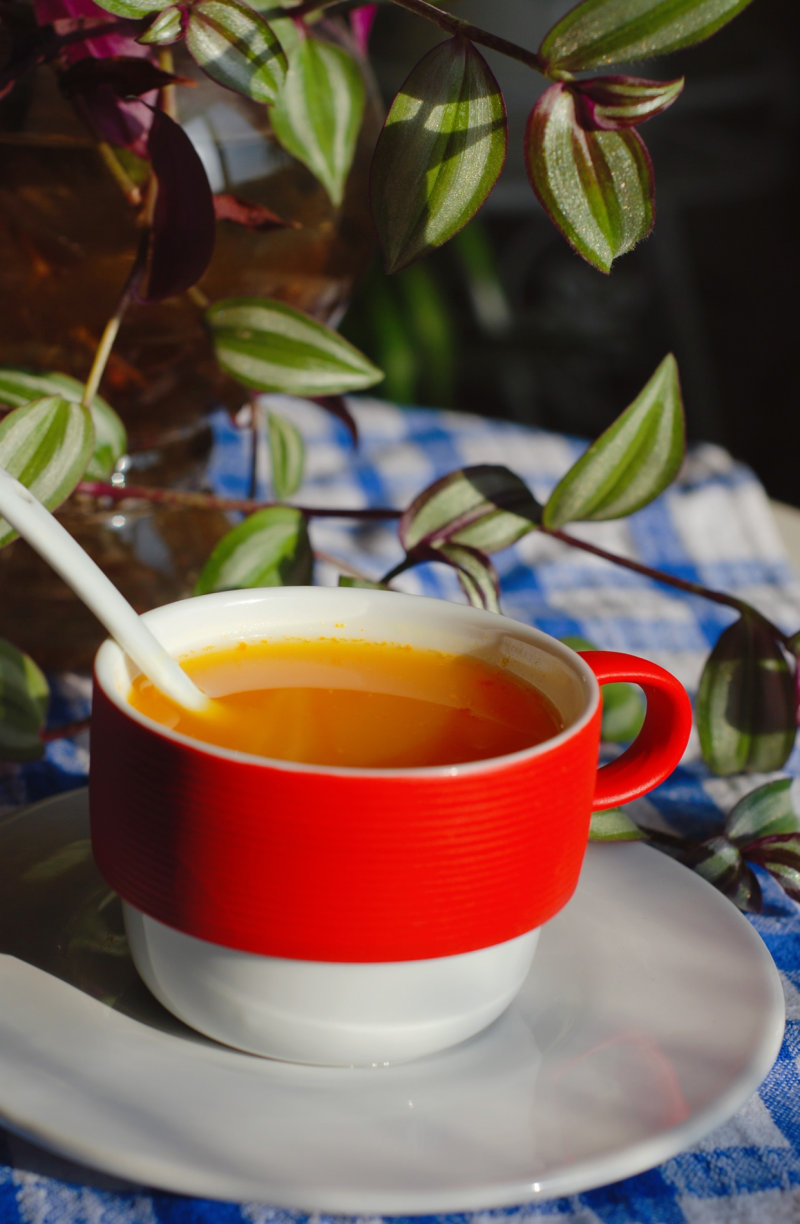 5:将豆浆过滤后倒入杯中即可食用,加入南瓜的豆浆色彩很诱人。
