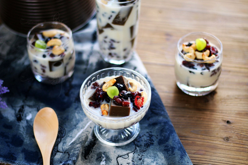 11:最后把凝固的龟苓膏切块,随意加上蜜豆、蔓越莓干、蓝莓干、腰果、倒入剩余的豆浆,用糖或蜂蜜炼乳调味