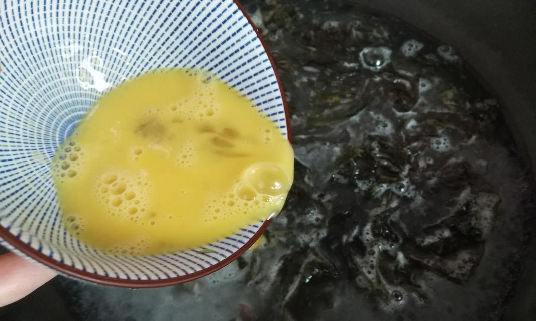 4.用勺子搅拌均匀后,在汤中慢慢打入鸡蛋。