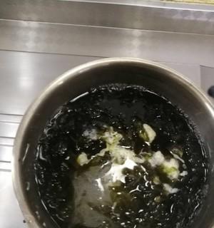 3.煮至番茄丁变得非常软烂,倒入预先准备好的紫菜块,并加入一勺鸡精。