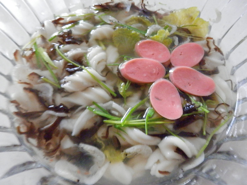 面粉适量;香菇少许;木耳少许;虾米少许;青蒜少许;火腿肠一根;