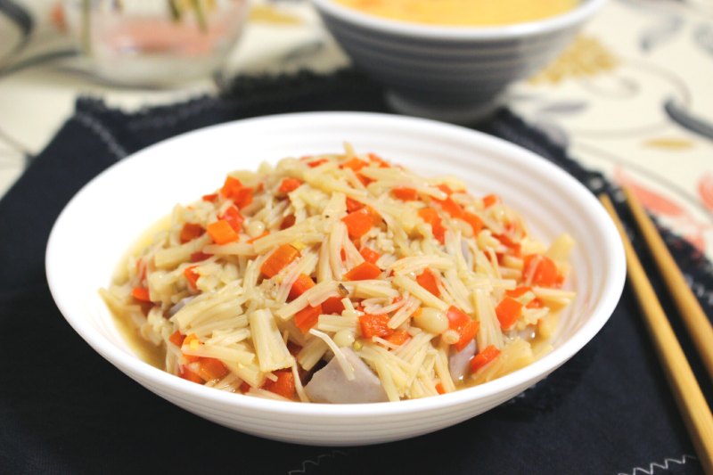 6:金针菇炒软后,加入小半碗水,加入适量生抽,盐和胡椒粉炒匀。
