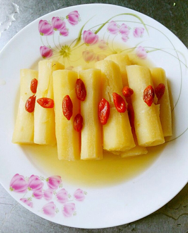 1:铁棍山药清洗干净,蒸熟。可以多蒸一些,凉透之后放在冰箱里,随用随去。