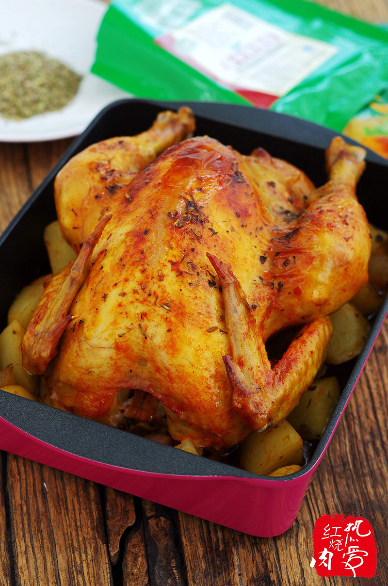 一、建议用的香草不要放或少放牛至,牛至的味道很霸道,感觉上如果放了它在其它调料里,会掩盖了其它调料的香味,还有就是鸡只放迷迭香比较香;二、鸡翅膀和大腿最突出的部分最容易烤焦,所以最好先包着这些部分,直至其它部分烤得六至七成,拆开锡纸再烤。