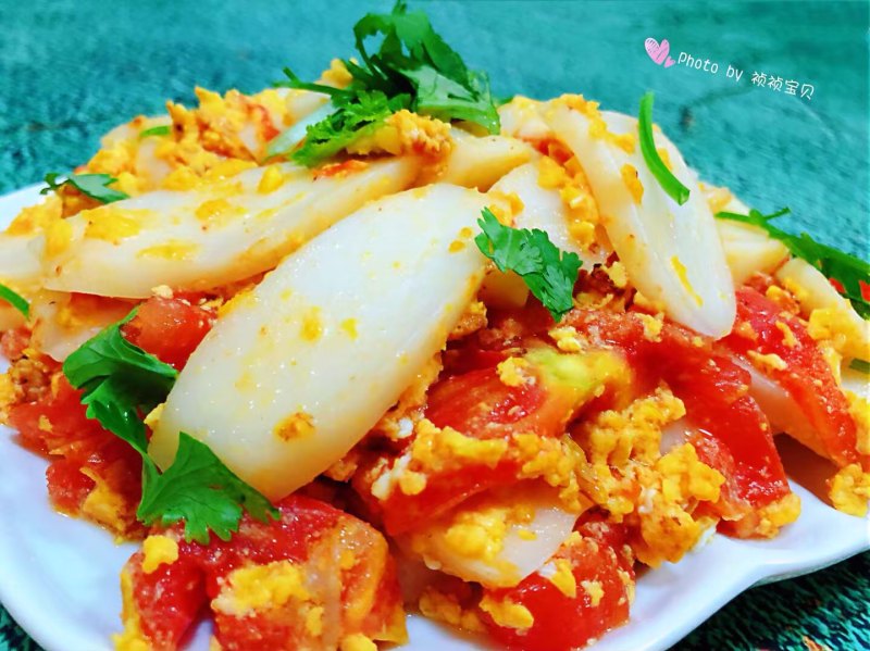 12:番茄鸡蛋炒年糕装入容器中再撒上香菜就大功告成了