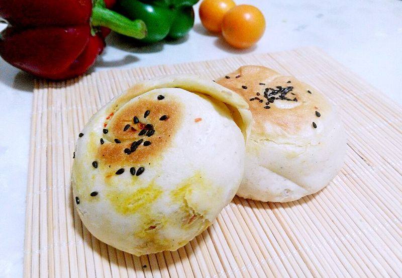 4:把馅料包入面团剂子中收口,反过来压扁,再次醒发10分钟。在平底锅中加入微量的油,放入醒好的馅饼,倒入半碗清水,淹没馅饼一半处。大火烧开转为中小火。收汁后反面小火继续加热1分钟即可。(不要煎到焦脆,馅饼还是软一点比较好吃)