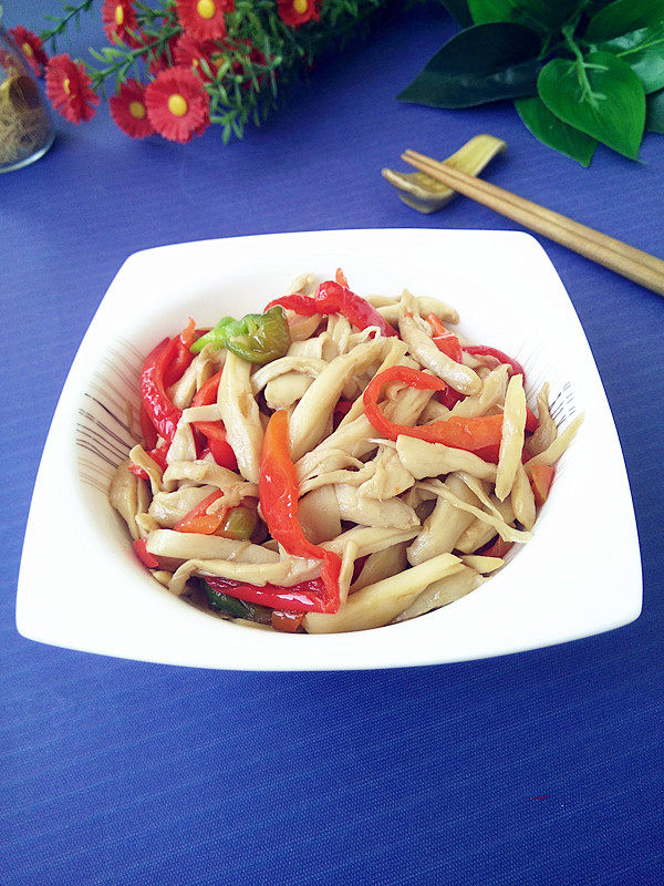 5:热锅后加适量食用油五成热时倒入辣椒丝爆出香味加入蘑菇丝