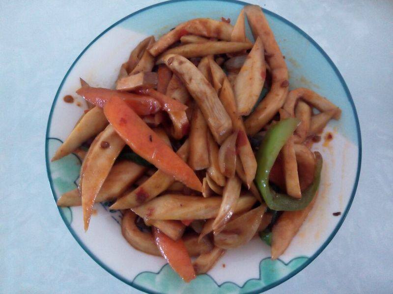 4:锅内依次放入色拉油、陴县豆瓣酱,花椒粉炒香,在放入切好的胡萝卜、洋葱、杏鲍菇,青椒翻炒一下少放盐(豆瓣酱咸),见杏鲍菇软了,有点出汤了,放入蚝油,收火,入盘!