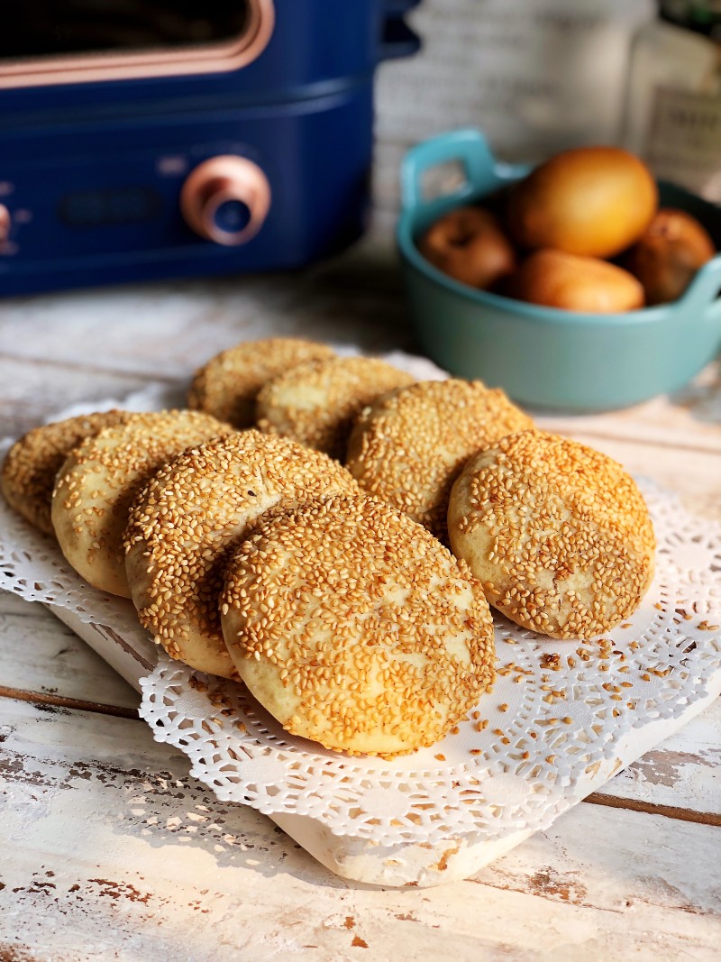 10:每个饼坯表面喷水蘸白芝麻,用手压实芝麻,不然会掉下来。