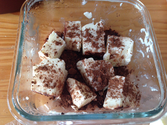 5:玻璃容器盖上盖子,放入冰箱冷藏一晚,取出切块,撒入可可粉。