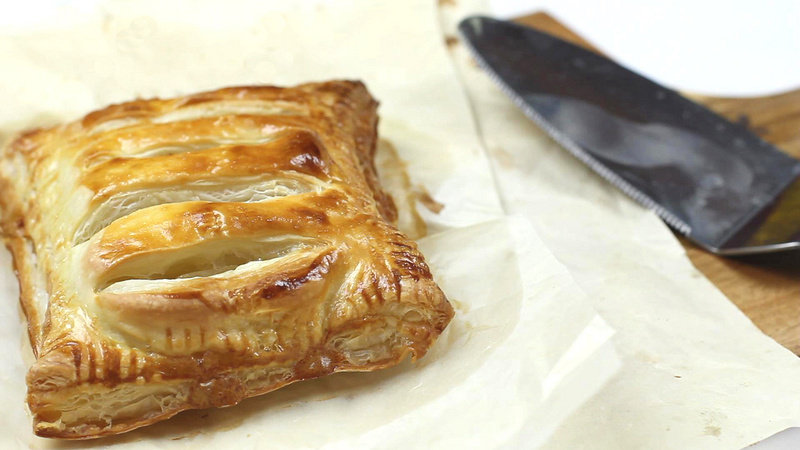 飞饼皮从冰箱拿出无需解冻过长时间。烤箱使用前预热至180度。涂抹蛋液是让成品成为金黄色的关键。