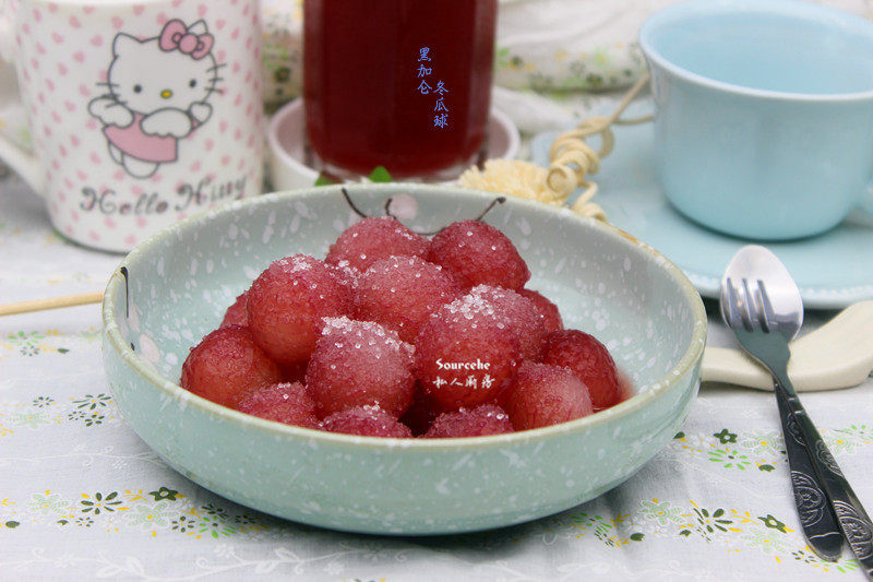 8:冬瓜球与黑加仑汁分开,冬瓜球撒些白砂糖,黑加仑汁做饮品。