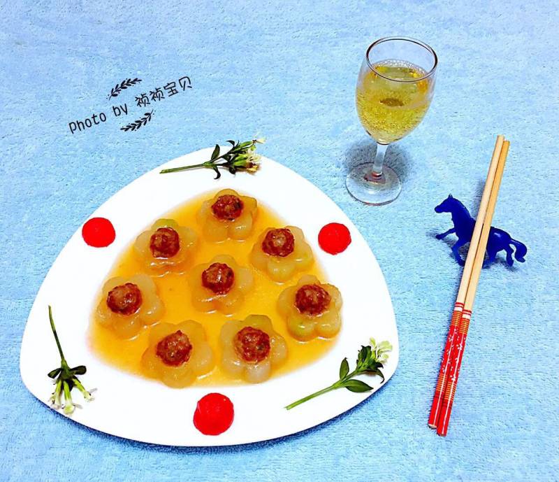 7:冬瓜镶嵌珍珠丸依次做好摆入盘中放入蒸锅大火蒸八分钟即可