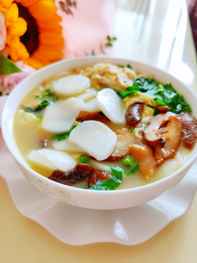 年糕500克;鸡蛋2个;干香菇几个;木耳菜少许;
