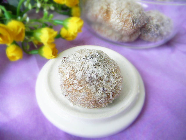 7:揉好的糯米,取出一块团圆在放好椰蓉的碟子上滚满椰蓉即可