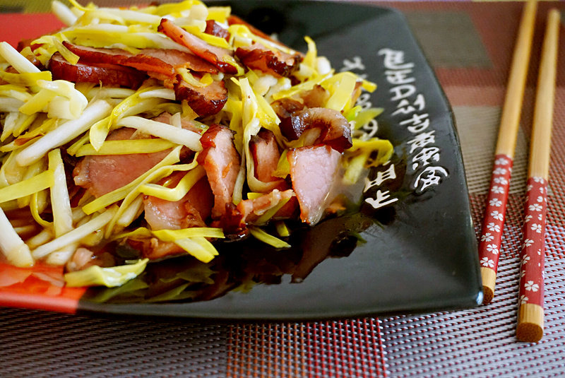 4:热锅后倒入少许色拉油,加入腊肉煸炒,要多煸炒一会儿,稍微焦黄了才好吃。