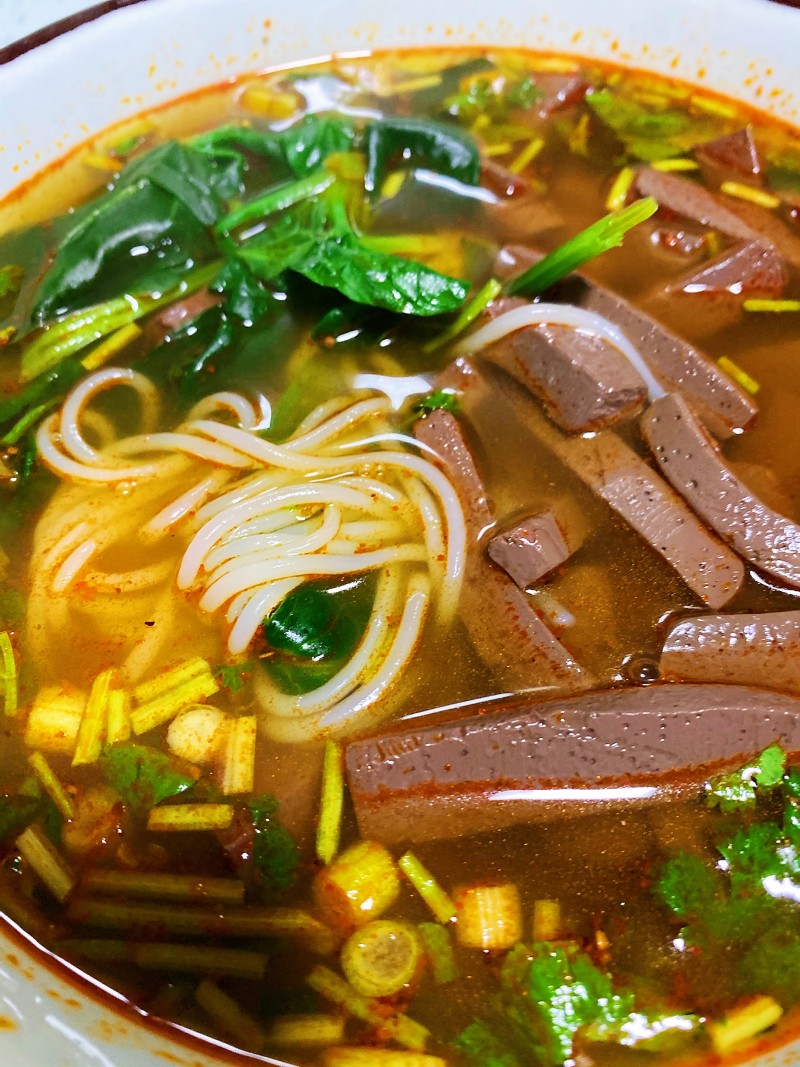 羊血1块;粉条1小把;小葱1根;香菜2棵;菠菜4棵;
