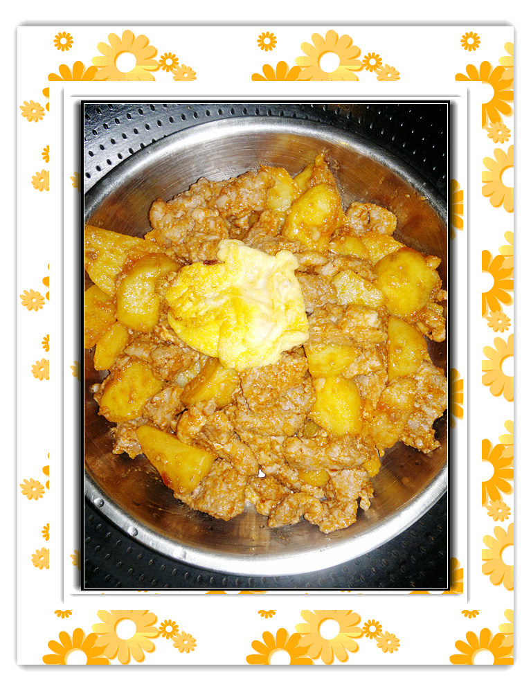 4:用不粘锅煎完薯子,同样的方法煎猪肉后,放适量番茄酱和一勺糖,调好味把猪肉和薯子一起炒匀就好了。我把蛋黄煎了放上面。