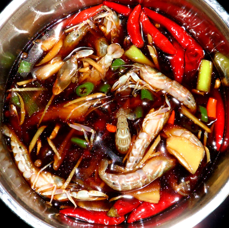 姜适量;蒜适量;香菜适量;葱白适量;干辣椒适量;小红尖椒适量;杭椒适量;花椒粒适量;八角适量;