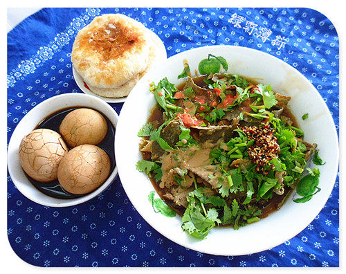 11:四味小料:酱豆腐和芝麻酱分别加水调成汁儿,香菜切碎,辣椒油可以自制(用热油浇在辣椒碎和黑白芝麻上即可,注意油温别太高)这四样小料,是锅巴菜的精华,缺一不可。