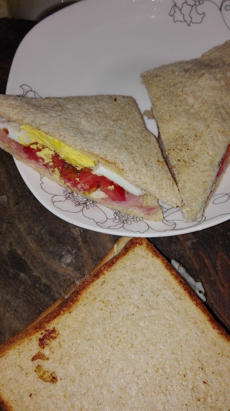 吐司3片;鸡蛋2只;火腿2片;