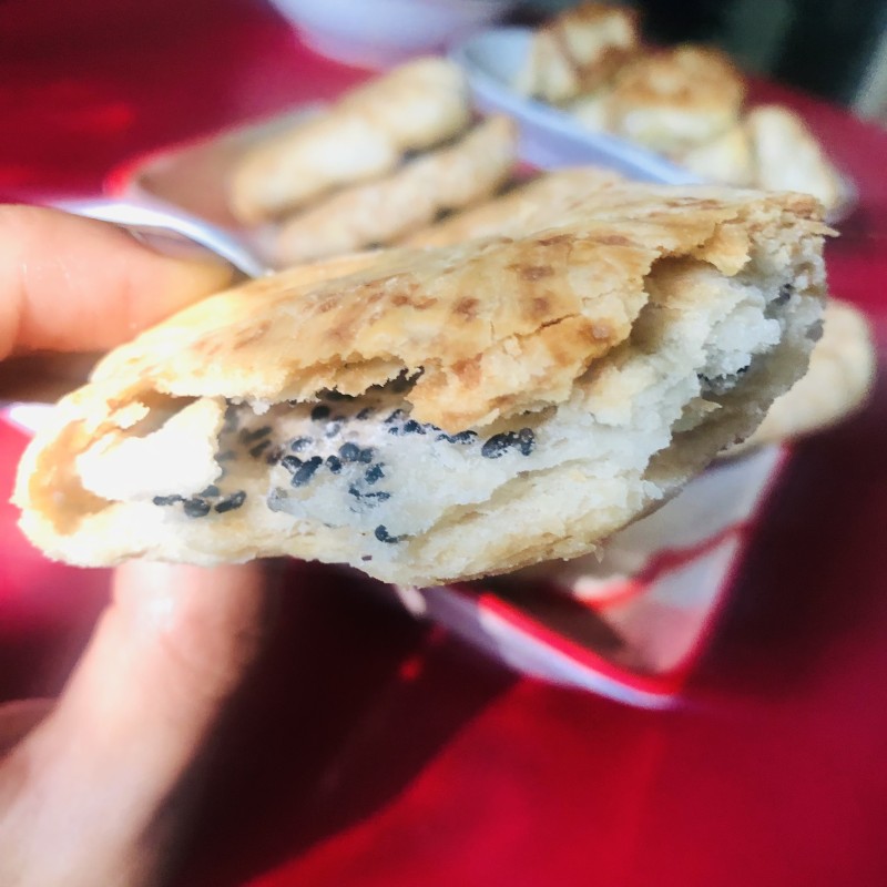 12:烙好的空心饼已经鼓起来了,表面的颜色可根据喜好调整时间,但不建议加热太长,防止面皮中的水分过度蒸发,影响口感。