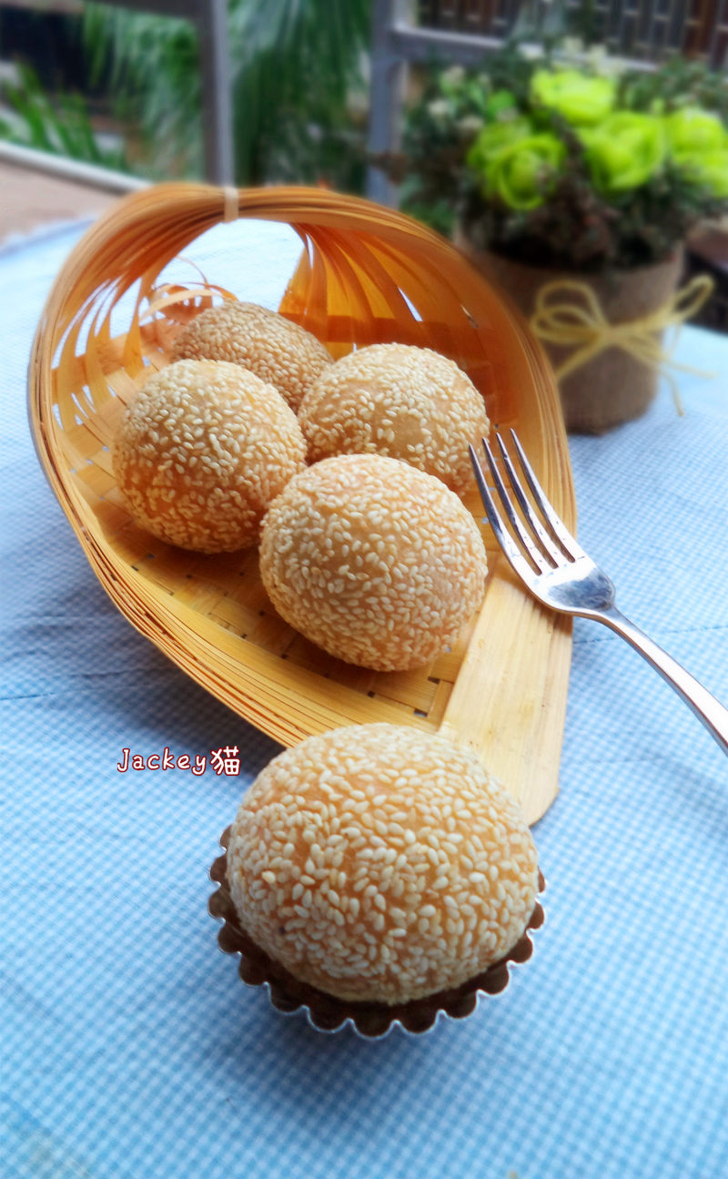 炸芝麻糯米球的时候,一定是冷油冷锅再放入,让火力慢慢地加热锅体与油温,这边糯米球也会随着温度的上升而慢慢地浸炸成熟,如果是热油下锅的话,那就很容易把外皮炸糊而内里的糯米厚层出现夹生的状态。